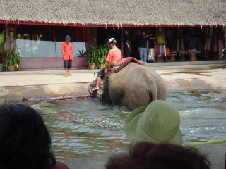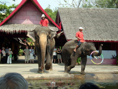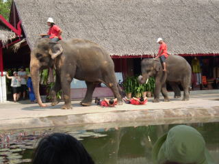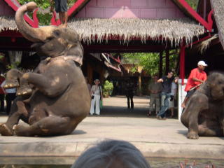 | この象さん、この後鼻から水鉄砲を噴射 下に人間が2人います。踏まずに上手に歩きます |