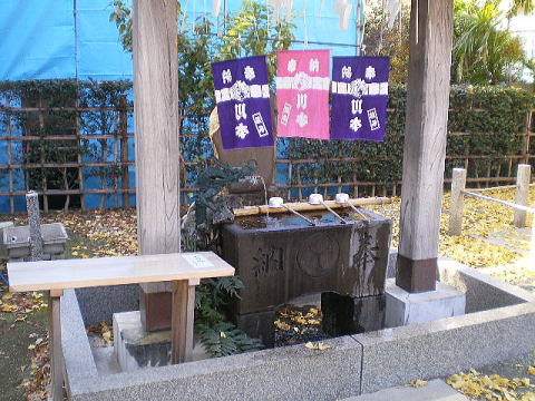 (1) 右手で柄杓(ひしゃく)を持ち、水を汲んで左手にかけ左手を清めます。