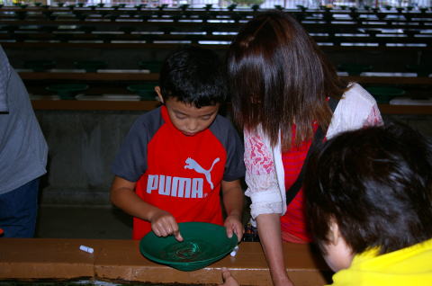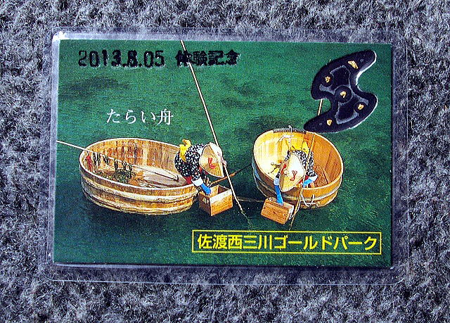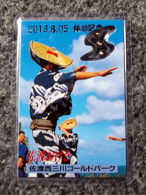 取れた砂金はこのようなカードにうめ込んで砂金入りのカードが出来上がると言う訳です。佐渡の形に5粒を埋め込んで貰いました。