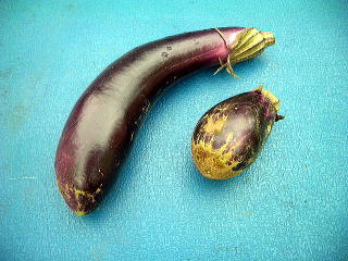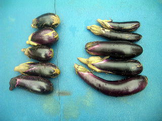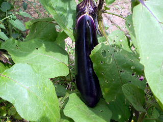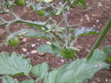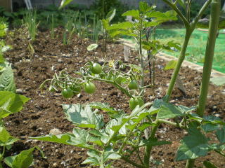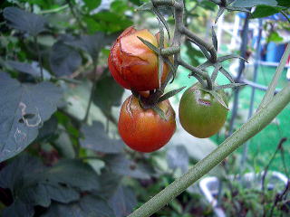 トマトもこのように枝が垂れんばかりに実をつけています。ナスも同様に少し目を離すと過熟児?になってしまいます。 |